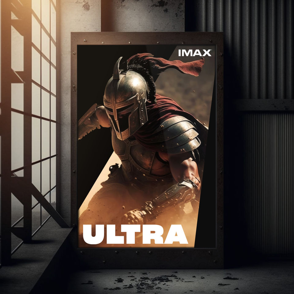 To convey the idea of high-quality blockbuster imagery, IMAX Ultra's identity adopts a minimalistic layout to enhance images. The projection shape acts as a diagonal frame holder across the whole canvas. To describe the immersive attribute, characters at times appear to leap out of the frame, adding depth to the artwork.